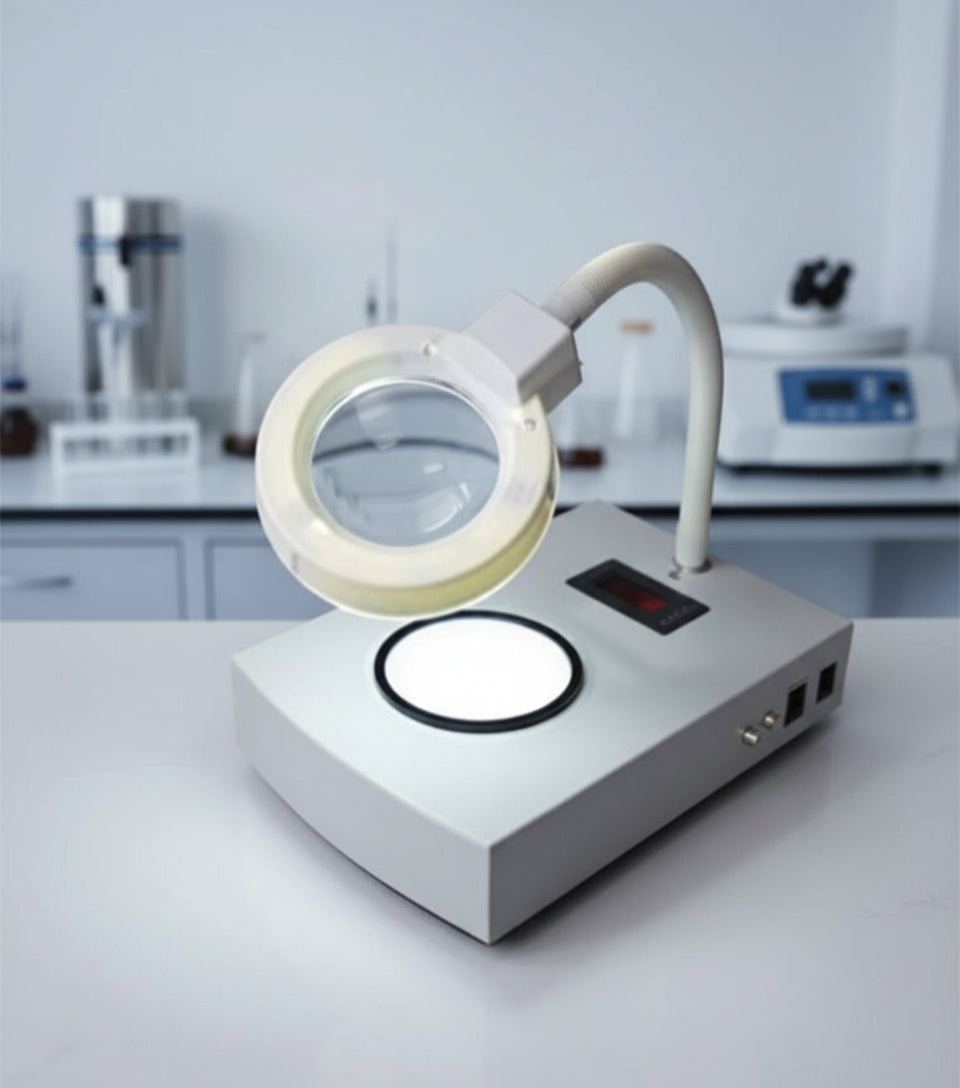 Digital CMOS-integrated colony counter with 13 mm LED display. Sensitive pen probe with sound indication, flexible magnifier arm (3×), automatic zero reset, correction keys (+/–). For Petri φ50–150 mm. Power: AC 220 V 50/60 Hz < 20 W. Dimensions 255×180×110 mm. Weight 2 kg.