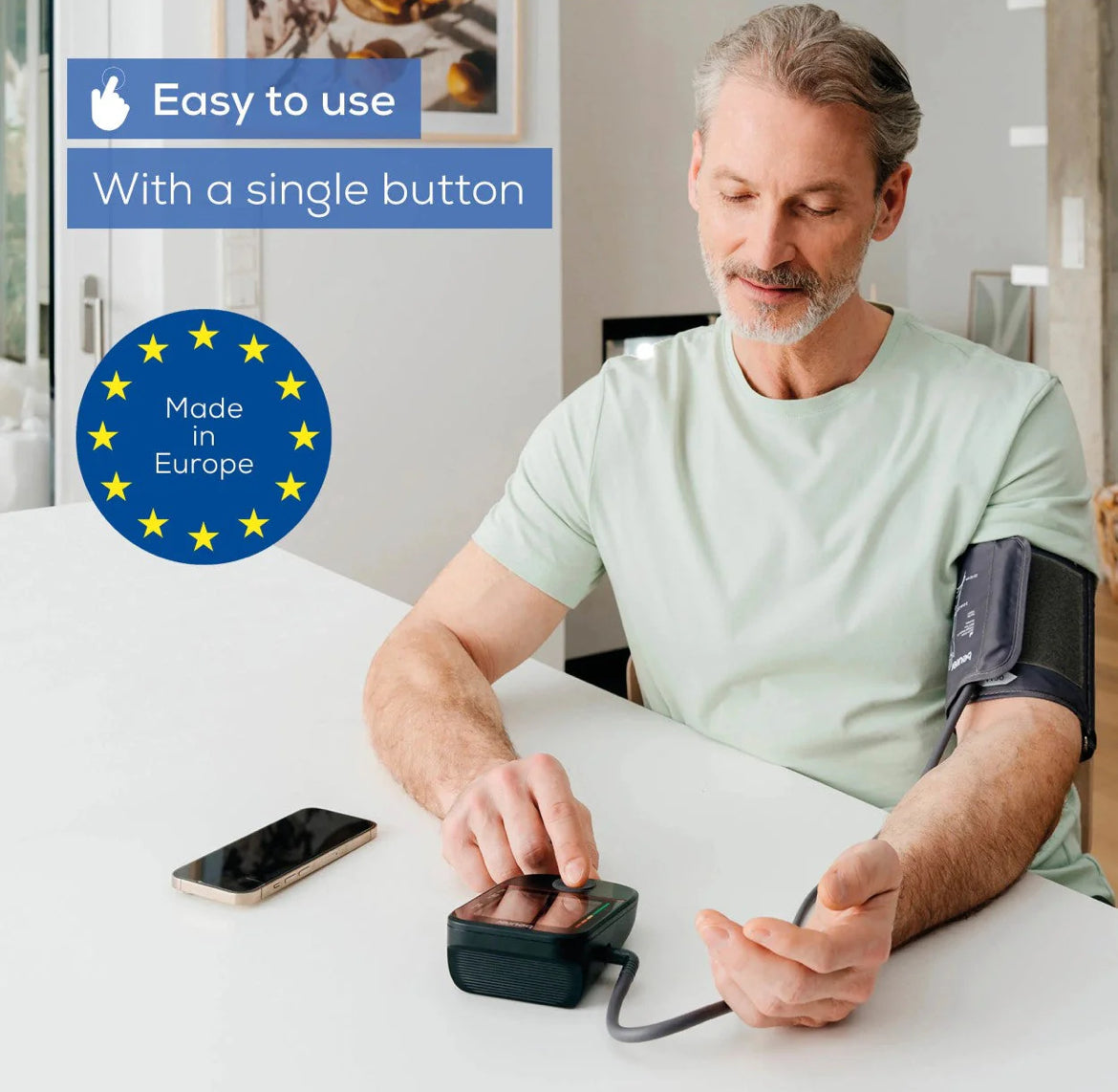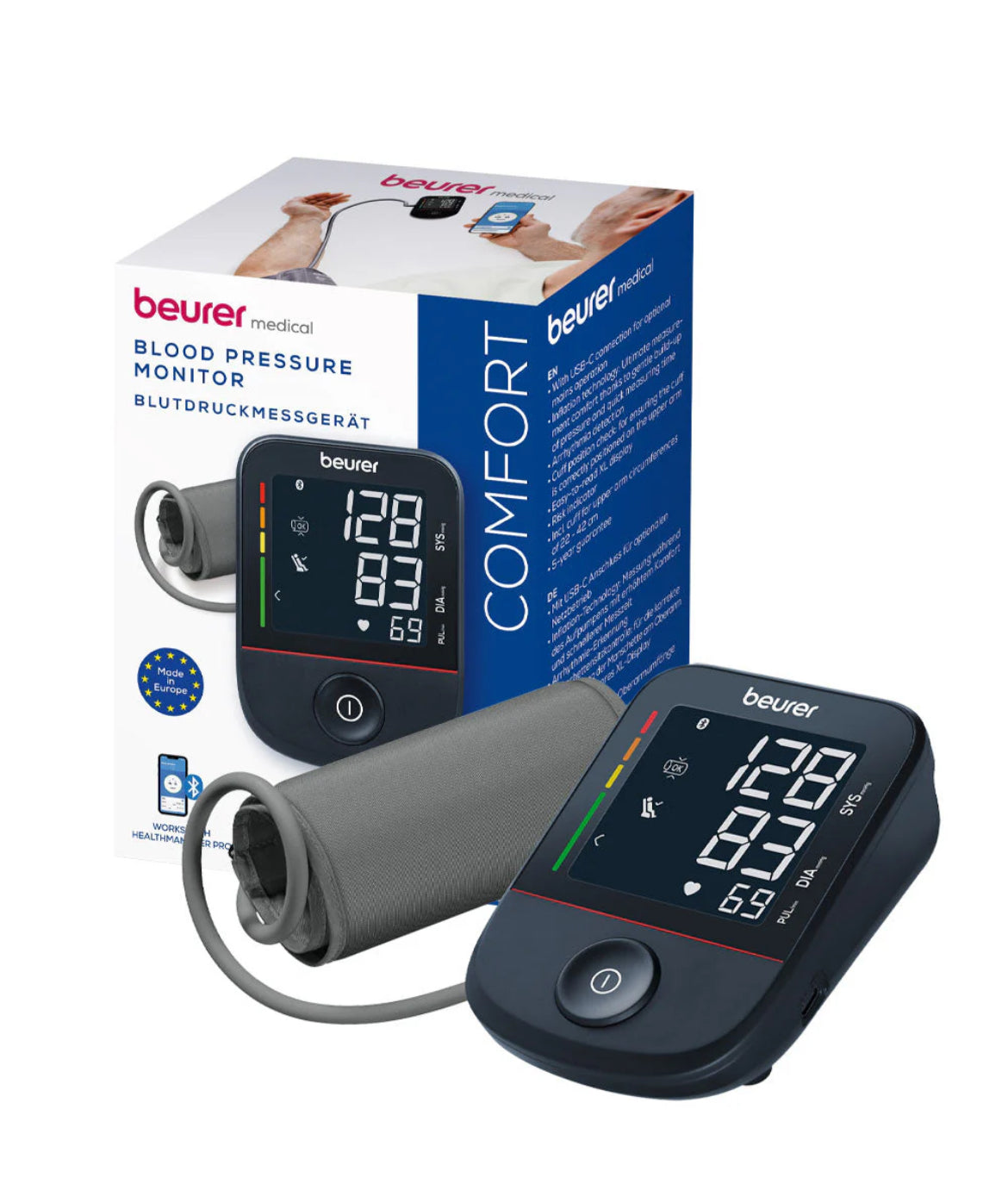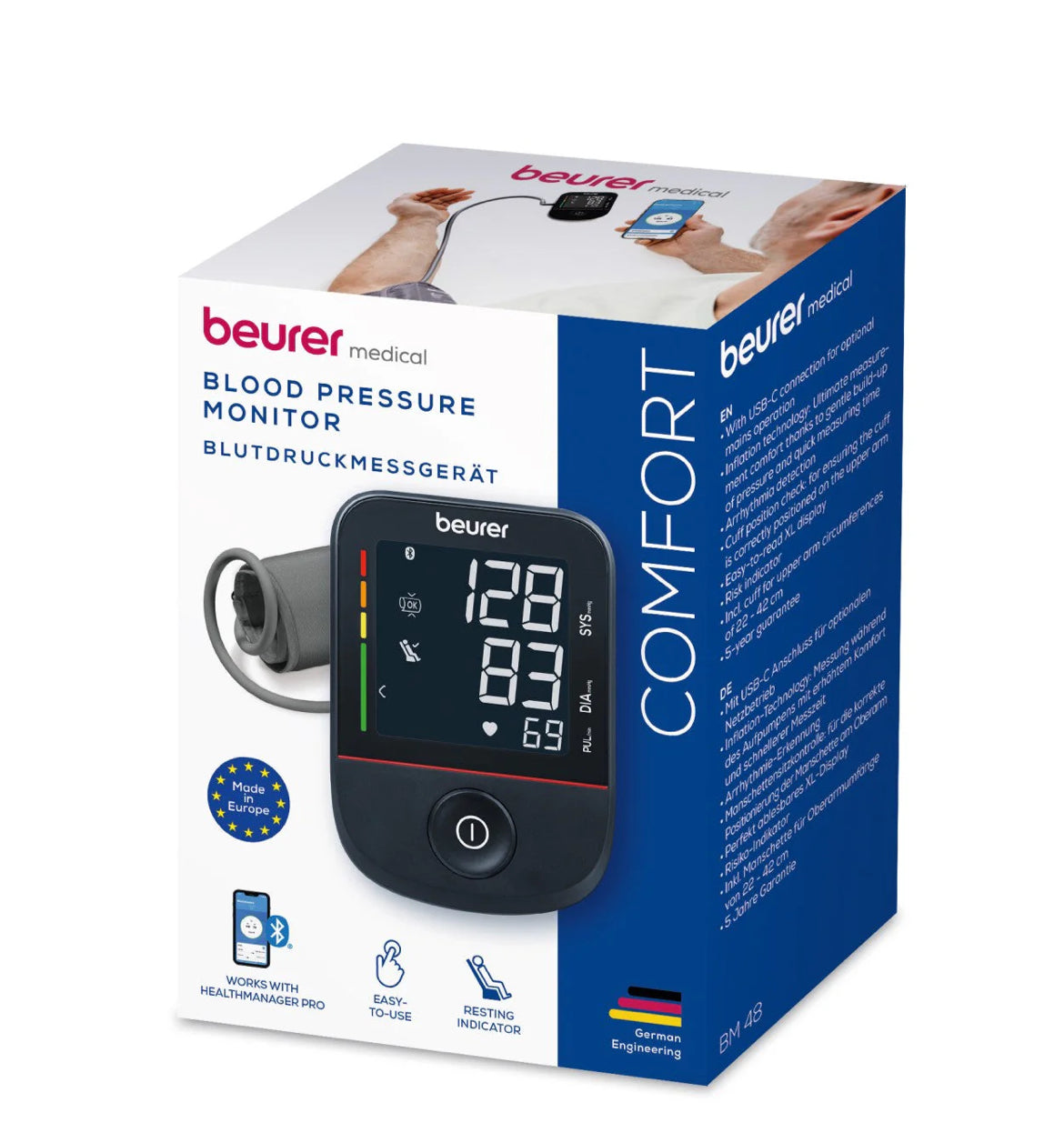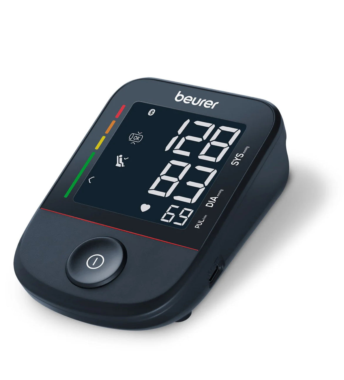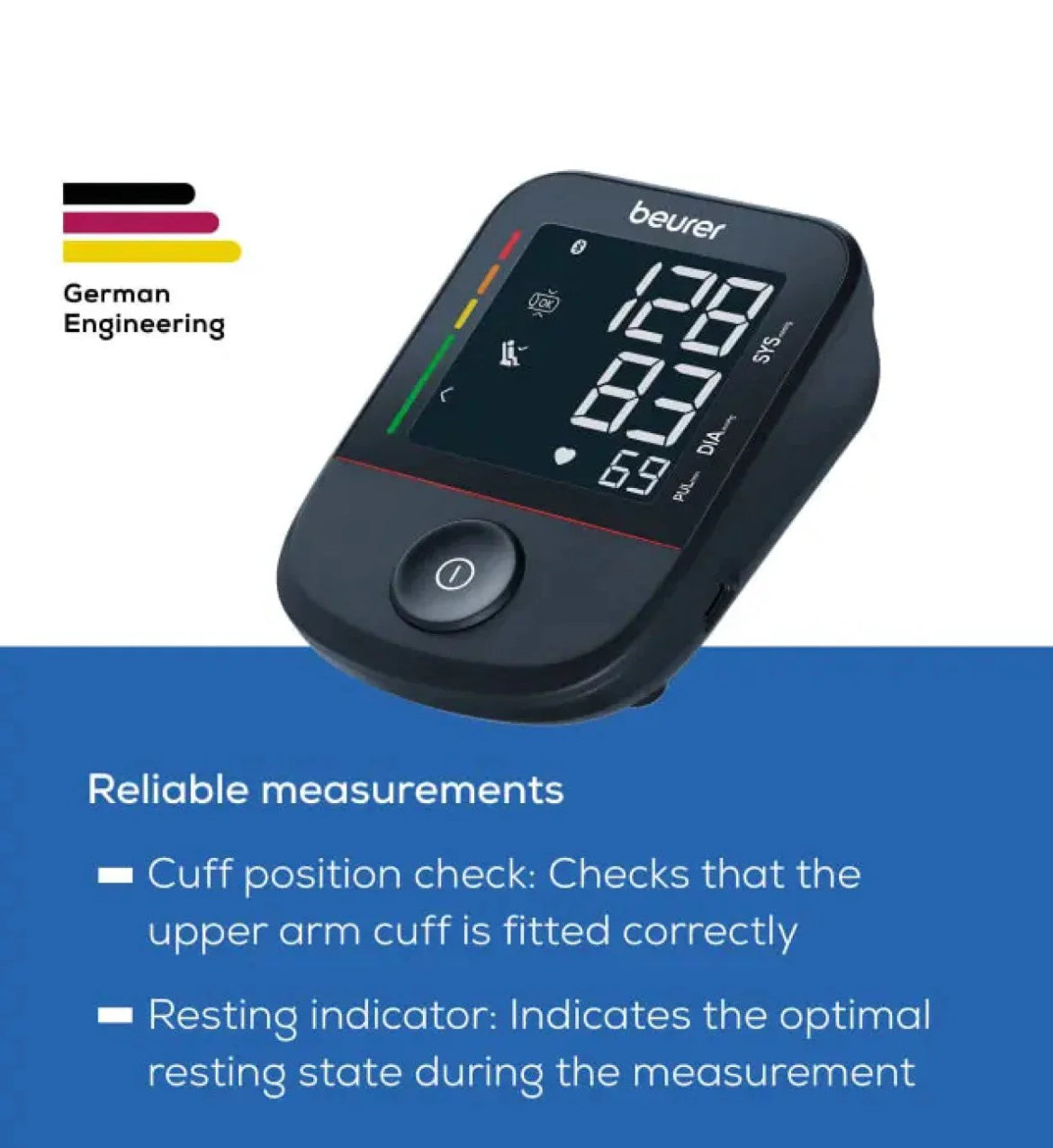 The Beurer BM 48 offers accurate, fully automatic blood pressure and pulse measurement with a one-touch operation. It features a patented resting indicator for precise results, cuff position control, and arrhythmia detection. The device connects via Bluetooth to the Beurer HealthManager Pro app for easy tracking.